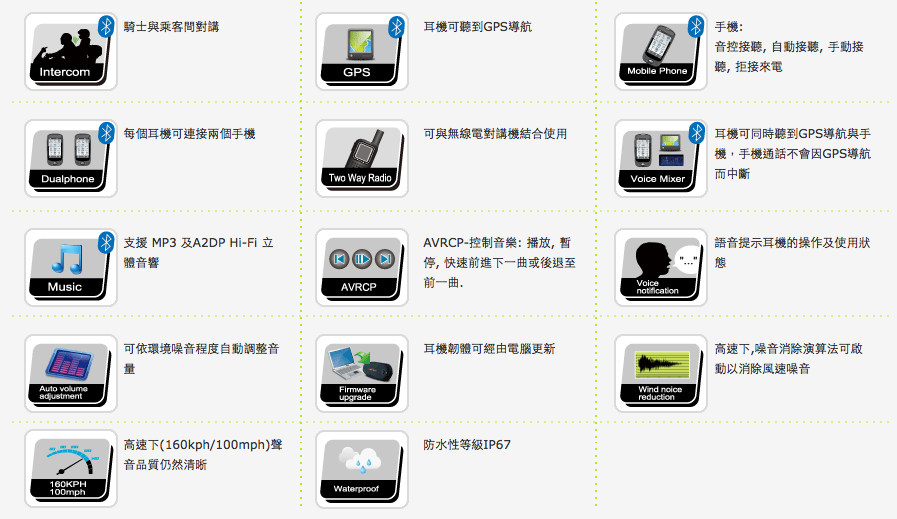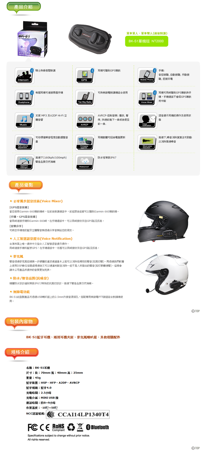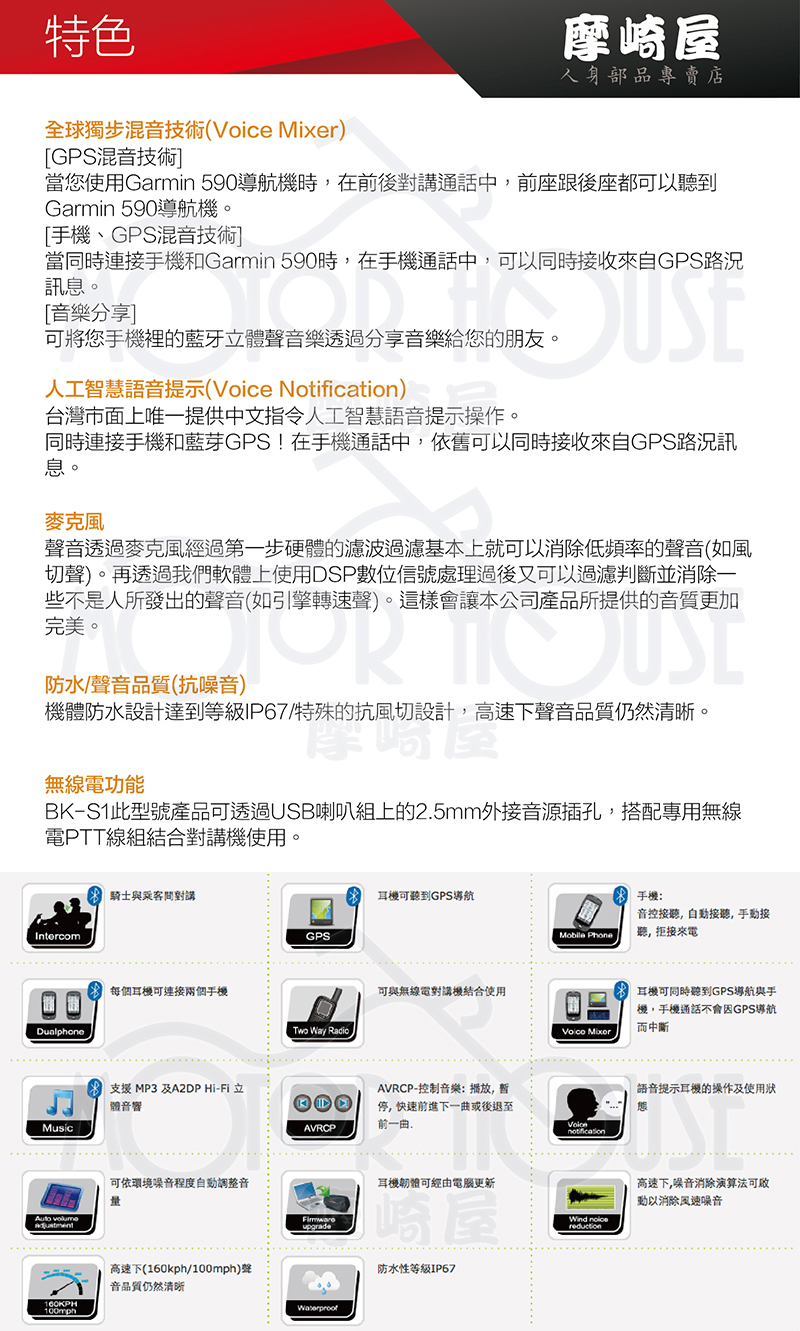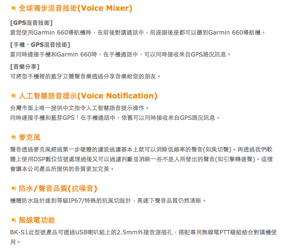 聲音經過麥克風後,經過硬體的濾波過濾基本上就可以消除低頻聲(如風切聲),再透過軟體上使用DSP數位信號處,更加一步過濾並消除一些非人為的聲音(如引擎轉速聲)。透過這兩步驟讓本公司產品所提供的音質更加完美,特殊的抗風切設計,使得聲音在高速下仍然清晰。